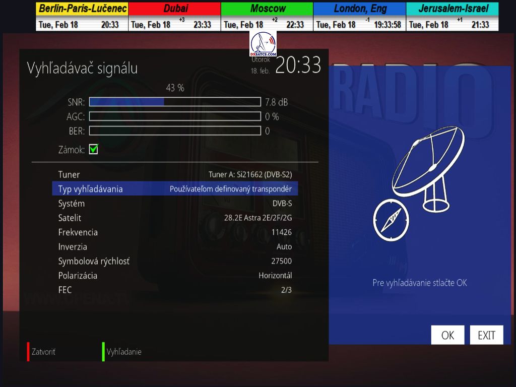 "Synchronisierte Nanokorrektur" beim Empfang des Transponders TP 115 von Satellit Astra 2E auf 28,5°E im UK SPOT BEAM-Bereich in Lučenec im Süden der zentralen