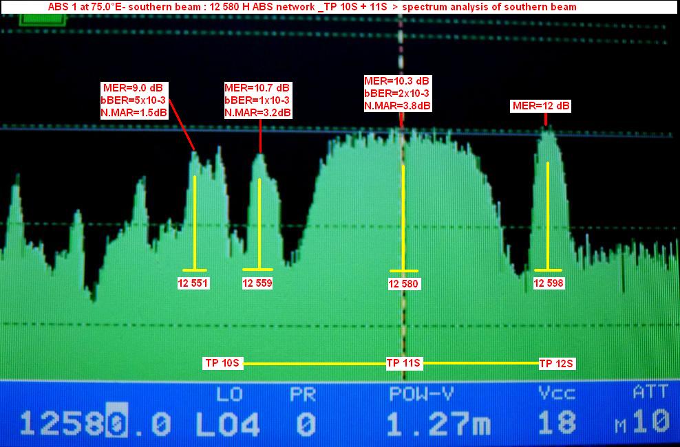 ABS 1 at 75.0°E-southern beam : 12 580 H ABS network- qualitative peak MER=10.2 dB