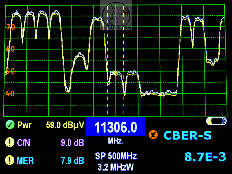 viď. aplitúda kvality okolo MER=8 dB na f=11 306+ 11 344 MHz
