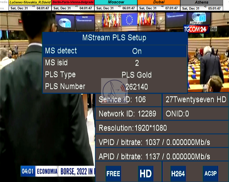 > PARAMETRE PRENOSU : DVB-S2 _ 8PSK _ SR=31 400 _ FEC=2/3 _ PLS Gold 262140 _ Multistream 1-2 <