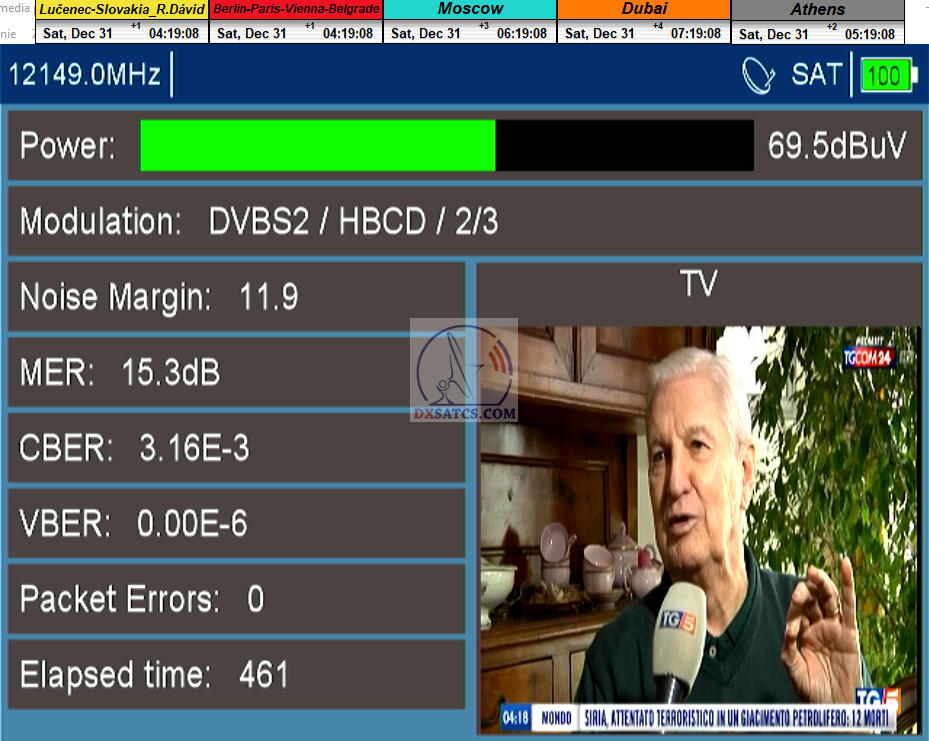 →pri poslednom zbere signálnych dát z TP IT2 som dňa 31.12.2022 zaznamenal špičku kvality MER=15,3 dB_čistá signálna rezerva okolo 8,5 dB. Práve tento typický,nie výnimočný signálny stav je tým rozhodujúcim v otázke argumentácie prečo práve tejto frekvencii priraďujem atribút referečná pre celé frekvenčné spektrum od 12 111 do 12 466 MHz v talianskom vyžarovacom diagrame.Autor Roman Dávid,konkrétne v tomto prípade opäť neprepisuje/nekopíruje a nepracuje už s dávno zadefinovanými faktami,ale na základe nespochybniteľne dokázaných výsledkov signálneho monitoringu v kvantite 1x72 hodín,stanovuje práve referenčnú frekvenciu f0=12 149 MHz_V ako ten prvý v Európe a to pre celú zónu príjmu "Out of footprint".Pochopiteľne ak by som atribút referenčnosti nedokázal v kontinuálnom signálnom monitoringu v kvantite 1x72 hodín,potom by som nič z predošlej vety nemohol tvrdiť,pretože Veda je postavená na nespochybnitelnom dôkaze a paveda na náhode pochádzajúcej len zo sporadicky prítomných špičiek výkonu v trvaní typicky jednotky hodín,ktoré sú bežnou súčasťou družicového príjmu a čakajú na ňu desiatky tisíc "Nadšencov nestabilných alebo náhodných príjmov" po celej Európe a Afrike,ktorí sa len pretekajú kto skôr prepíše kolonku v prehľadoch TVR vysielania.