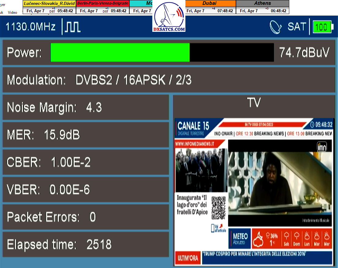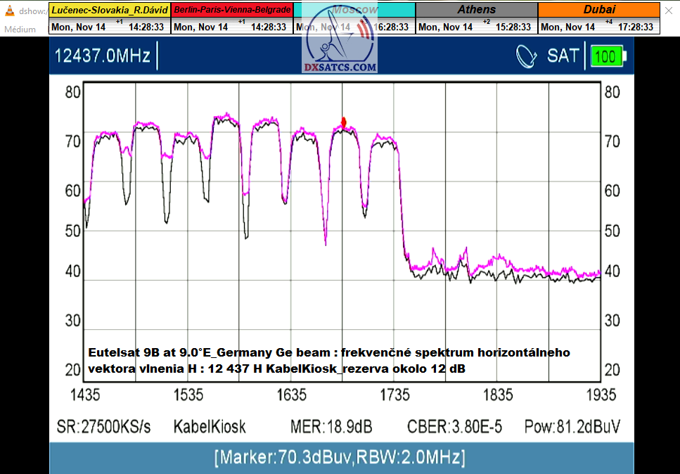 ►v signálnom monitoringu dokázaný a plne stabilný príjem bez jediného výpadku za jednotku t=72 hodín,pri častých dažďových prehánkach a každodenne dosiahnutá špička kvality okolo SNR=13,8 dB s tunerom TBS 5925/5927 alebo okolo MER=14,2 s analyzátorom Metek HD na f=12 111 V .