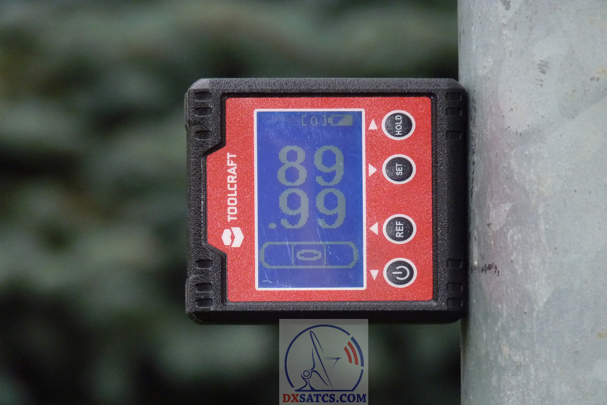 Digitálny dvojosý (X+Y) uhlomer s rozlíšením 0,01° a presnosťou ±0.1° verifikuje dosiahnutie inštalačnej kolmosti a stabilitu statívu účinne vyváženého anténneho systému Prodelin 450 cm s hmotnosťou okolo 670 kg aj so závažím.Inštalačná kolmosť,stabilita statívu a účinné vyváženie v smeroch N-S a E-W sú nevyhnutným predpokladom pre presný a plne manuálny výkon autorovho technologického postupu "Synchrónnych nanokorekcii" s mimoriadne vysokou náročnosťou na presnosť a stabilitu zmien vykonaných korekcií .