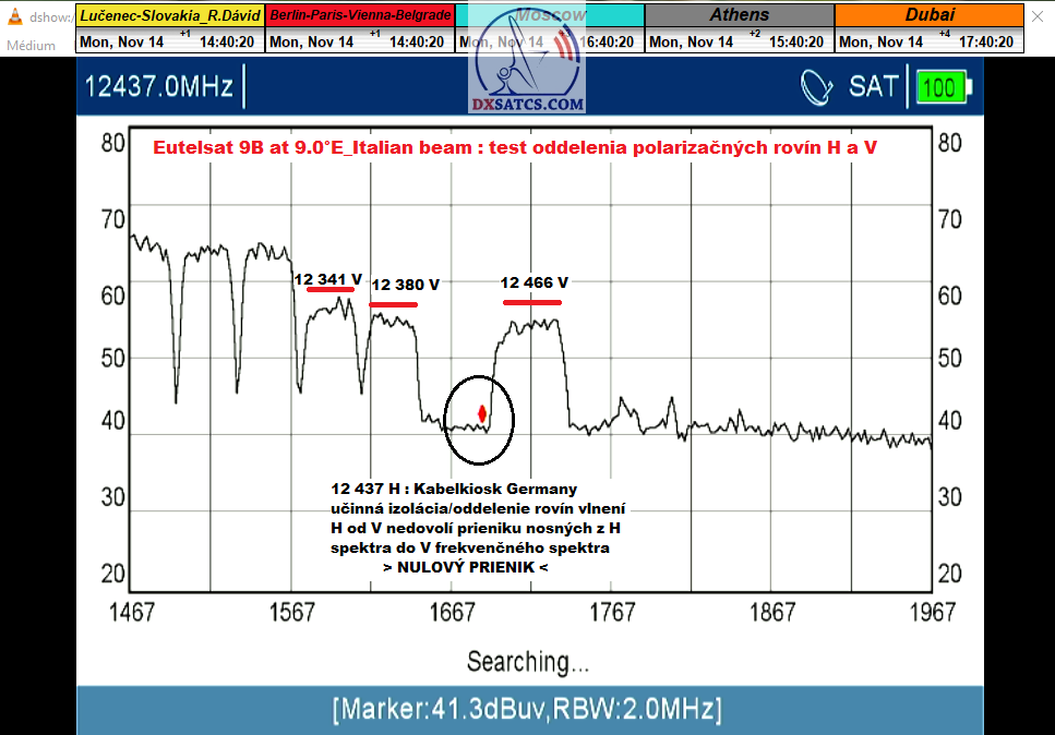 > táto moja "logická a zjednodušujúca myšlienková skratka" platí výlučne pre časť frekvenčného spektra od 12 111 do 12 466 MHz-V v zemepisných podmienkach strednej a východnej Európy družice Eutelsat 9B na 9.0°E pretože napríklad vo frekvenčnom spektre od 10,7 do 10,95 GHz GEO objektu Astra 2E_UK beam platí presný OPAK môjho predchádzajúceho tvrdenia pre identickú zemepisnú oblasť,pretože tam je miera vzájomnej