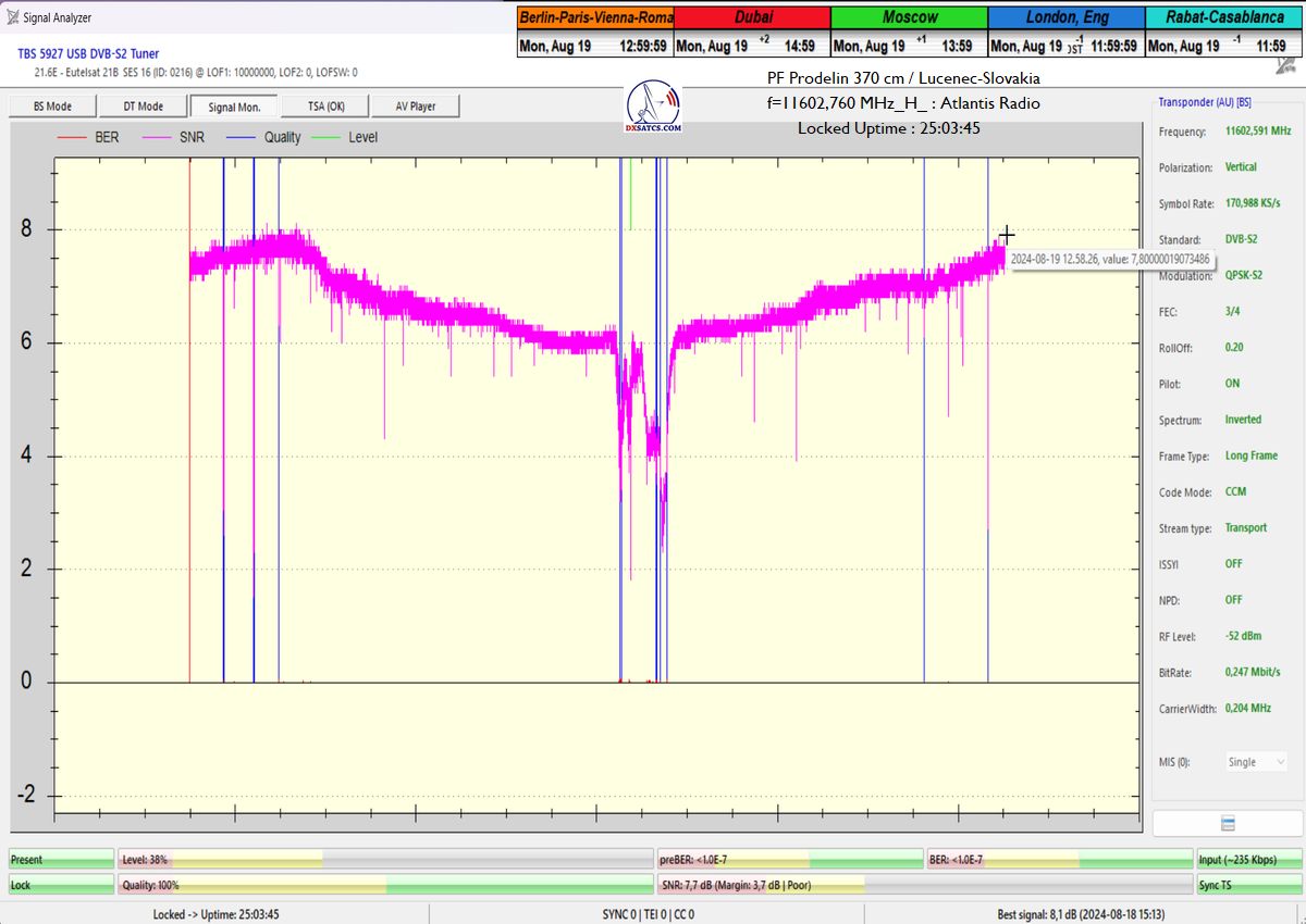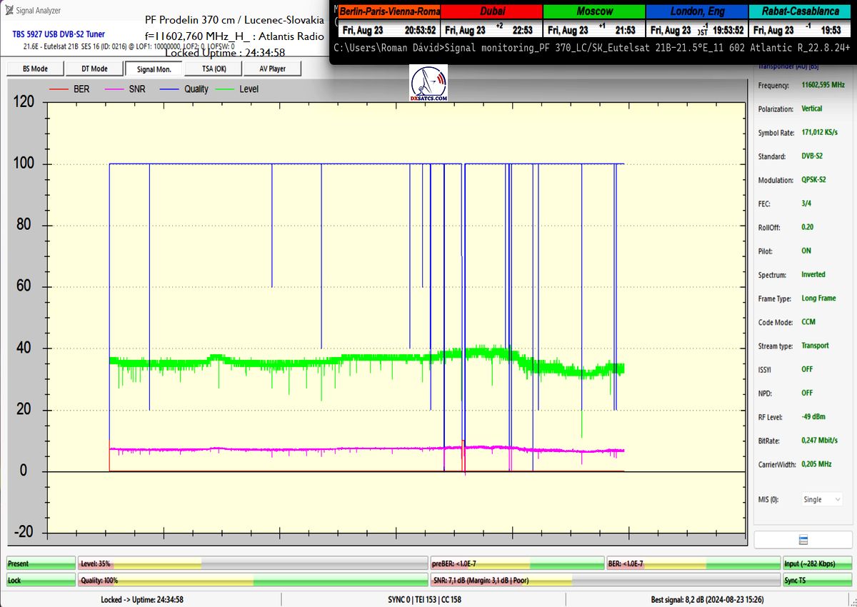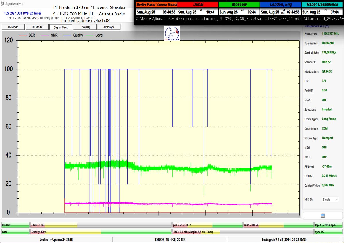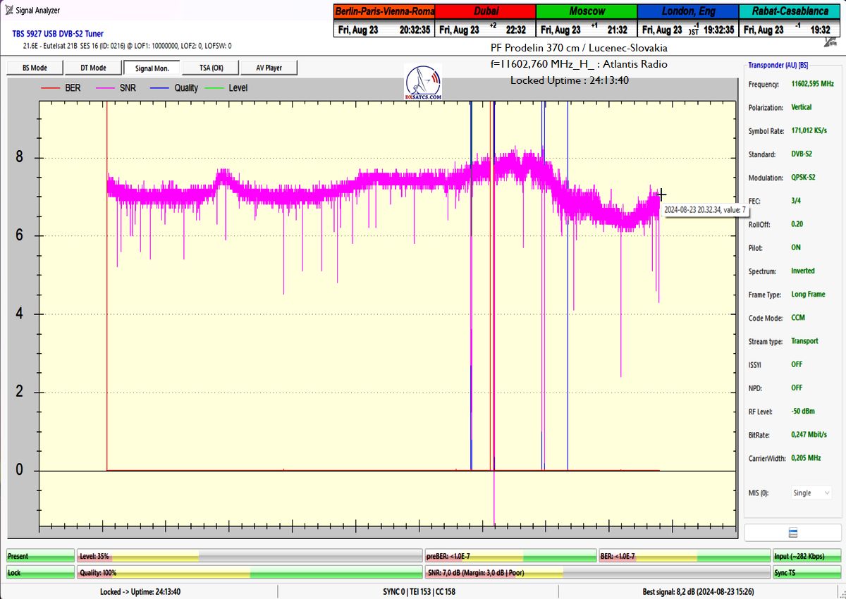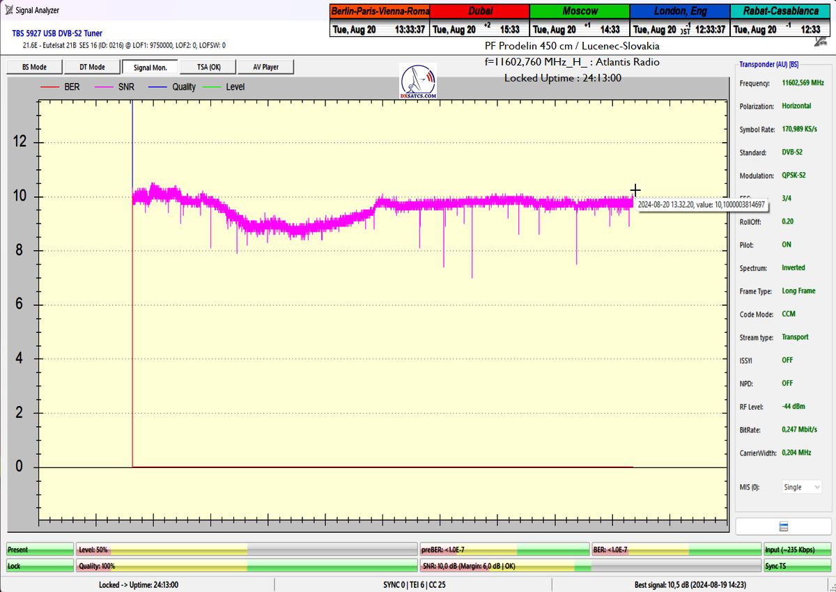 Classification of the achieved results: Despite the fact that the peak quality achieved with the applied oscillator LOF1=10.00 GHz exceeded the peak quality of LOF2=9.750 GHz by 0.7-0.8 dB, or 7.4 dB with LOF2 < 8.1 dB-8.2 dB with LOF1, I did not achieve 100% reception stability with either oscillator, and during  the 24-hour period, there were typically 8-10 dropouts in the continuity of the Lock, which I can quantify as a degraded reception stability of 99.05% with LOF1 and 99.87% with LOF2. With LOF1, I recorded a total of 4 dropouts lasting around 40 seconds each and one long dropout lasting 780 seconds, amounting to 820 seconds in total, due to the fact that the restoration of the Lock after its loss or dropout is not instantaneous and typically takes around 5 seconds at the given SR=171 ksym/s. Paradoxically, I achieved higher reception stability with LOF2=9.75 GHz than with LOF1,  despite the overall higher SNR peak quality by approximately 0.7-0.8 dB with LOF1=10.00 GHz.  You may ask how a dropout in the continuity of the Lock is visualized on the signal monitoring graph? The answer: When the blue quality curve (which drops to 0%) and the red BER error rate curve merge on the X-axis, an immediate dropout in the continuity of the Lock occurs,  meaning the radio stream data flow freezes. Temporary drops in the blue quality curve (Q) in percentages, for example to levels of 40% or 20%, also have an impact on the smoothness of the data/stream flow, but do not cause a dropout in continuity. This is known as the threshold or limit state of reception with minimal signal reserve in the signal chain.
