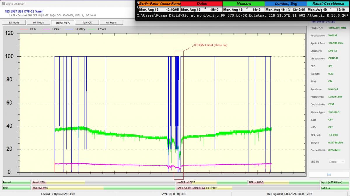so špičkou kvality SNR=10,8 dB a to pri ideálnych poveternostných podmienkach.Typická signálna rezerva počas dňa permanentne oscilovala v rozsahu špičiek od 5 do 6,8 dB.