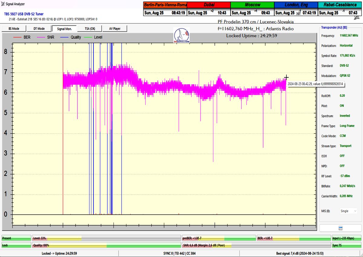 Klassifizierung der erzielten Ergebnisse: Trotz der Tatsache, dass die erreichte Spitzenqualität mit dem angewendeten Oszillator LOF1=10,00 GHz die Spitzenqualität von LOF2=9,750 GHz um 0,7-0,8 dB oder 7,4 dB mit LOF2 < 8,1 dB-8,2 dB mit LOF1 übertraf, erreichte ich bei keinem der Oszillatoren  eine Empfangsstabilität von 100%, und im Verlauf von 24 Stunden kam es typischerweise 8-10 Mal zu Ausfällen in der Kontinuität des Locks, was ich als eine degradierte Empfangsstabilität von 99,05% mit LOF1 und 99,87% mit LOF2 quantifizieren kann. Mit LOF1 habe ich insgesamt 4 Ausfälle mit einer Dauer von etwa 40 Sekunden und einen langen Ausfall mit einer Dauer von 780 Sekunden aufgezeichnet, was insgesamt 820 Sekunden ergibt, da die Wiederherstellung des Locks nach seinem Verlust oder Ausfall nicht sofort erfolgt und typischerweise etwa 5 Sekunden bei der gegebenen SR=171 ksym/s dauert. Paradoxerweise habe ich eine höhere Empfangsstabilität mit LOF2=9,75 GHz als mit LOF1 erreicht, obwohl die insgesamt höhere Spitzenqualität des SNR mit LOF1=10,00 GHz um etwa 0,7-0,8 dB höher war. Sie fragen sich vielleicht, wie sich ein Ausfall in der Kontinuität des Locks im Signalüberwachungsdiagramm visualisiert? Die Antwort: Wenn die blaue Qualitätskurve (die auf 0% fällt) und die rote BER-Fehlerrate-Kurve auf der X-Achse zusammenfallen, kommt es zu einem sofortigen Ausfall in der Kontinuität des Locks, anders gesagt, der Datenstrom des Radiostreams friert ein.  Vorübergehende Einbrüche der blauen Qualitätskurve (Q) in Prozent, zum Beispiel auf 40% oder 20%, haben ebenfalls einen Einfluss auf die Fließfähigkeit des Datenstroms/Streams, führen jedoch nicht zu einem Ausfall der Kontinuität. Dies wird als Schwellen- oder Grenzzustand des  Empfangs bei minimaler Signalreserve in der Signalkette bezeichnet.