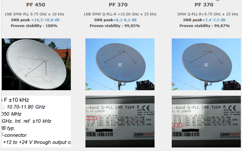 PF Prodelin 370 cm > Primary feedhorn placed in the manual SKEW rotation mechanism > OMT type ESA-1212-X/1 > LNB SMW Q-PLL type R, LOF stability +/- 25 kHz