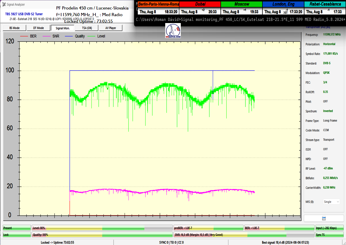 ►Eng_Classification of achieved results at f=11 599,760 MHz: Signal monitoring over a unit length of t=72 hours irrefutably proves that I have achieved 100% reception stability in practice, without a single interruption in Lock continuity throughout the entire monitoring period. The daily peak quality oscillated around an SNR of 18.4 dB, which provides an immediate quality margin of nearly 13 dB with, of course, a zero level of Viterbi Precorrection <1.0E-7. Occasional drops in instantaneous quality never exceeded an SNR of 9.7 dB.