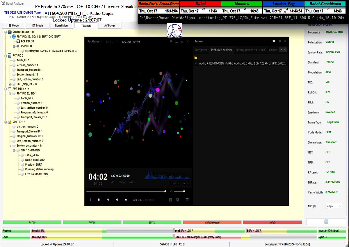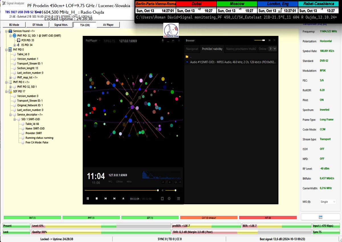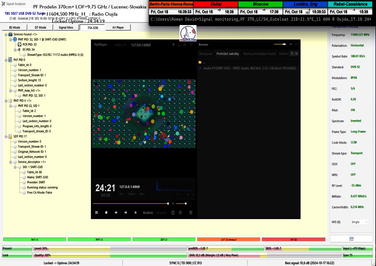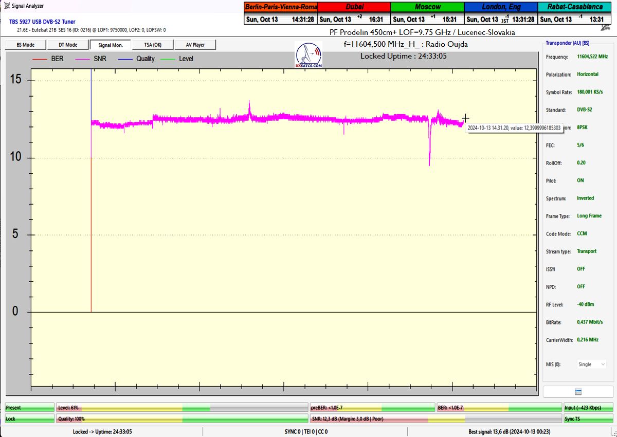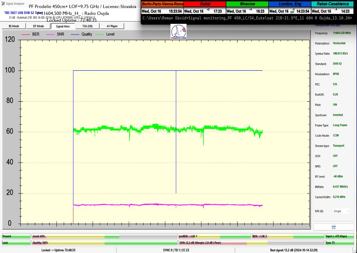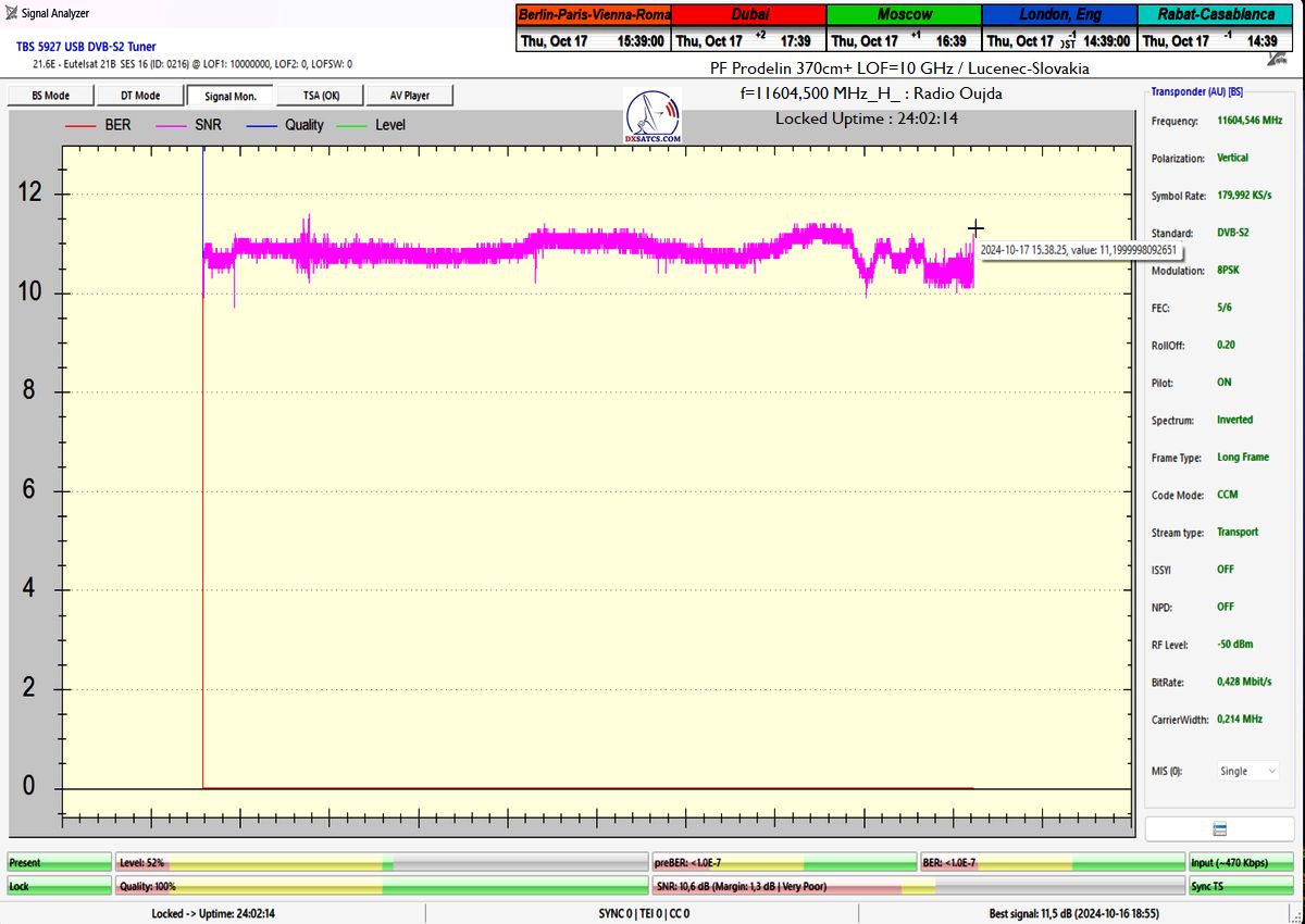 SK: EUT 21B_11 604,500 MHz-Radio Oujda : Dokázaná kontinuita funkcie locku,alebo stabilita príjmu na 100% na výstupe z PF 450+370 cm na každom z troch oscilátorov v celkovej kvantite dokazovania t=144 hodín,pre rádio nosnú s aplikovanou hodnotou Symbolovej rýchlosti SR=180 ksym/s a so špičkou kvality SNR=13,7 dB