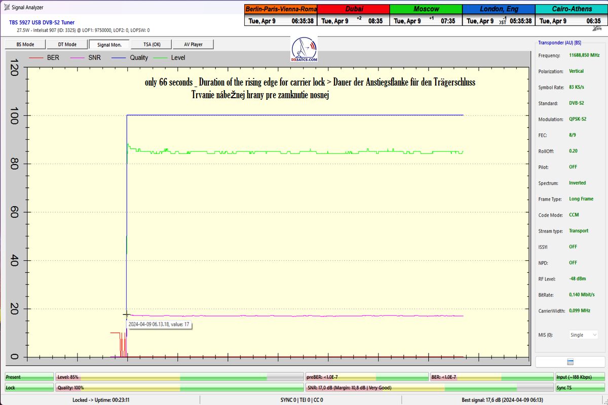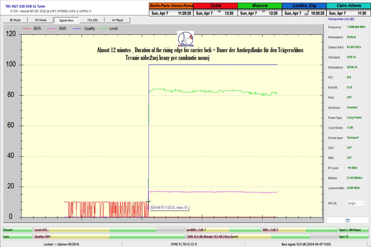 že som dosiahol jeden konštantný priebeh LOCK-u so špičkou kvality SNR=17 dB,bez jediného výpadku v kontinuite kvality Q, inak povedané dôkazná