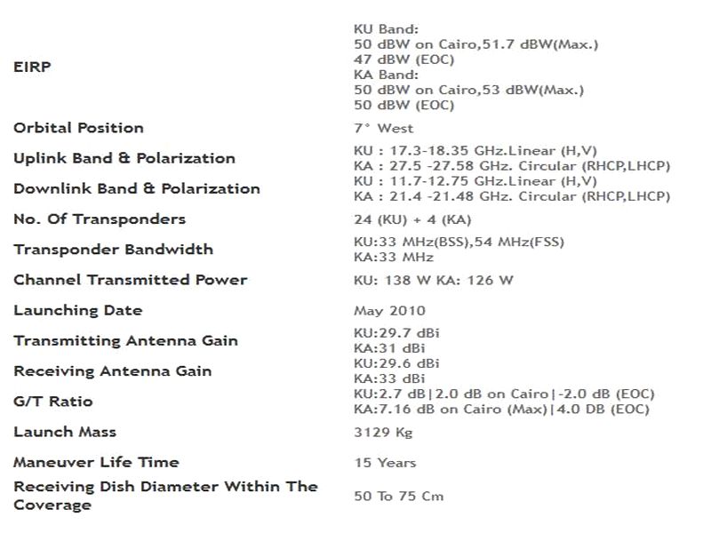 Nilesat 201-7°W-KA band  : general description  /  (source : nilesat.com.eg )