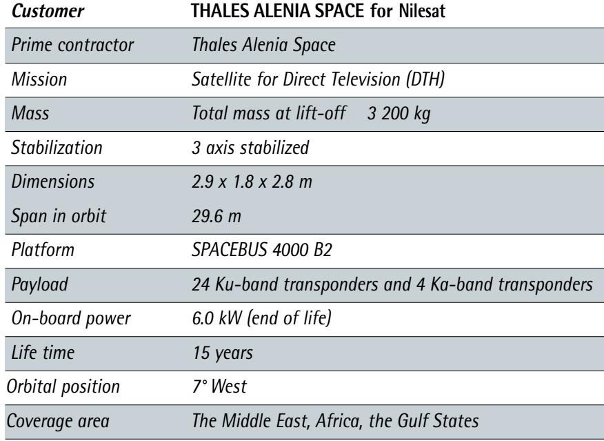 It is one of the Nilesat’s second generation satellites. It is manufactured by Thales Alenia Space Company. It was launched by Ariane 5
