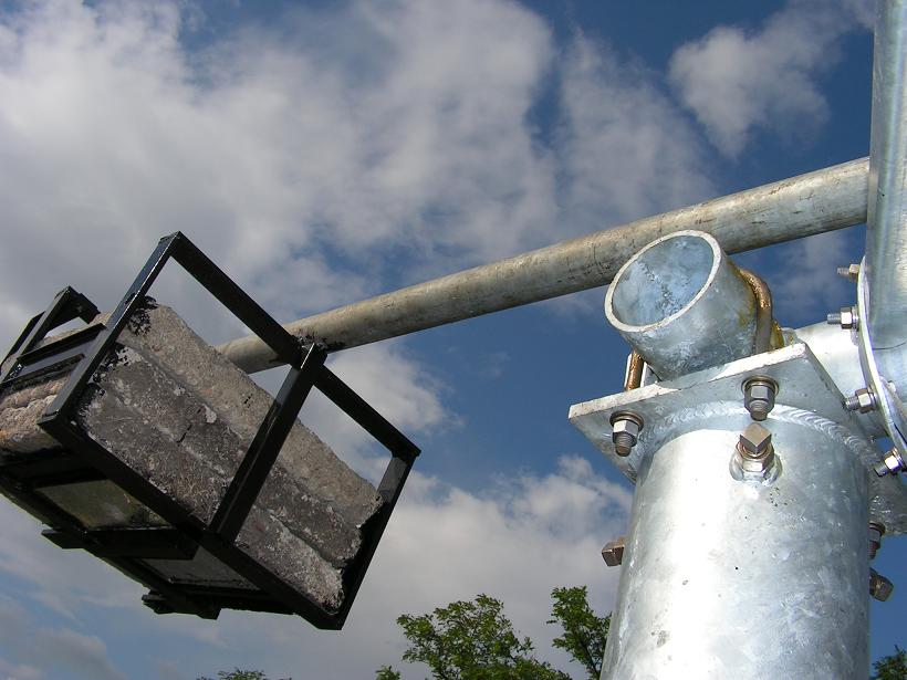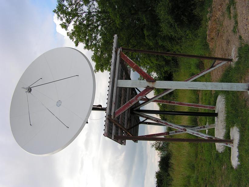 Stredový parabolický reflektor Prodelin s pasívnym priemerom reflektorovej plochy 370 cm je umiestnený viac ako 500 cm nad zemským povrchov.Nosnú konštrukciu tvorí hrubostenná rúra s hrúbkou steny 4,5 mm,ktorá je zasadená do otvoru v zemi o rozmere 120/120 cm v hĺbke 140 cm.Na dne vyhĺbenej otvoru v hĺbke 140 cm je v betónovom lôžku z vysokokvalitného cementu používaného na mostové konštrukcie zabetónovaná oceľová platňa s postrannými vzperami o rozmere 50/50 cm hrúbky 2 cm na ktorú bola po dôkladnom vyzretí betónu prizváraná nosná hrubostenná rúra s priemerom 133 mm na konci ktorej je kvôli doporučenému priemeru nosného tubusu anténneho systémú prizváraná oceľová hrubostenná rurá s vonkajším priemerom 169,2 mm na ktorú sa inštaloval celý anténny systém.Stabilizačný faktor celého systému tvoria postranné vzpery z oceľových profilov hrúbky 4 mm,ktoré dodatočne stabilizujú nielen nosnú rúru ale aj plošinu o rozmere 520/160 cm.Na betonárske práce som minul okolo 3 500 kg /+ 1 000 kg na podpornú konštrukciu/ vysokokvalitného betónu s minimálnym podielom skál.