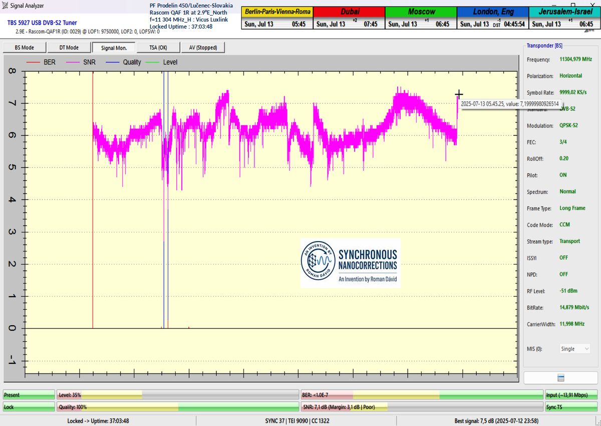 ENG_As verified by the visualized method of evidence in the signal monitoring unit with a duration of t = 79 hours (which equals exactly 284,400 seconds),the total length of Lock losses or oscillations near the noise threshold amounted to only fifteen seconds out of the entire 284,400-second interval. This corresponds to a signal stability of exactly 99.99%.The sole guarantor of the achieved signal stability from f = 11,304 MHz_H, as demonstrated below, is the technological invention entitled Synchronous Nanocorrections, developed by the scientist and inventor Roman Dávid from Lučenec. As further proven, this invention enables sudden increases in signal quality, immediately raising the signal margin by +0.5 to +2.5 dB