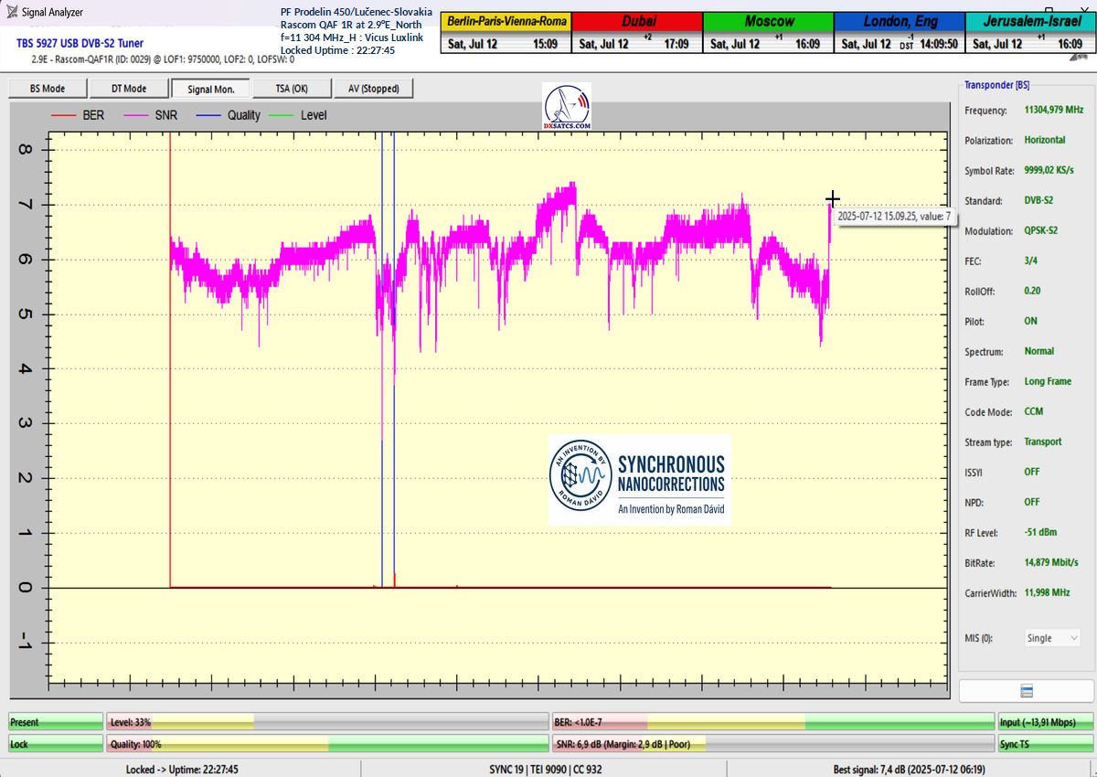 SK_Ako potvrdzuje vizualizovaná forma dokazovania v signálnom monitoringu s trvaním t = 79 hodín (čo predstavuje presne 284 400 sekúnd), výpadky v Locku alebo oscilácie kvality v okolí šumového prahu sa vyskytli v celkovom trvaní iba pätnásť sekúnd z celkových 284 400 sekúnd. To zodpovedá percentuálnej stabilite príjmu na úrovni presne 99,99 %.Jediným garantom dosiahnutej stability príjmu na frekvencii f = 11 304 MHz_H je — ako to následne dokazuj— technologický vynález s názvom Synchrónne nanokorekcie, ktorého autorom je vedec a vynálezca Roman Dávid z Lučenca. Tento vynález zabezpečuje náhle a skokové zlepšenia kvality príjmu, ktoré okamžite zvyšujú signálnu rezervu v rozsahu od +0,5 do +2,5 dB.