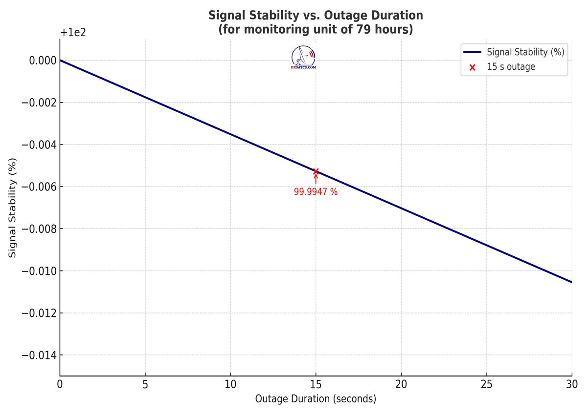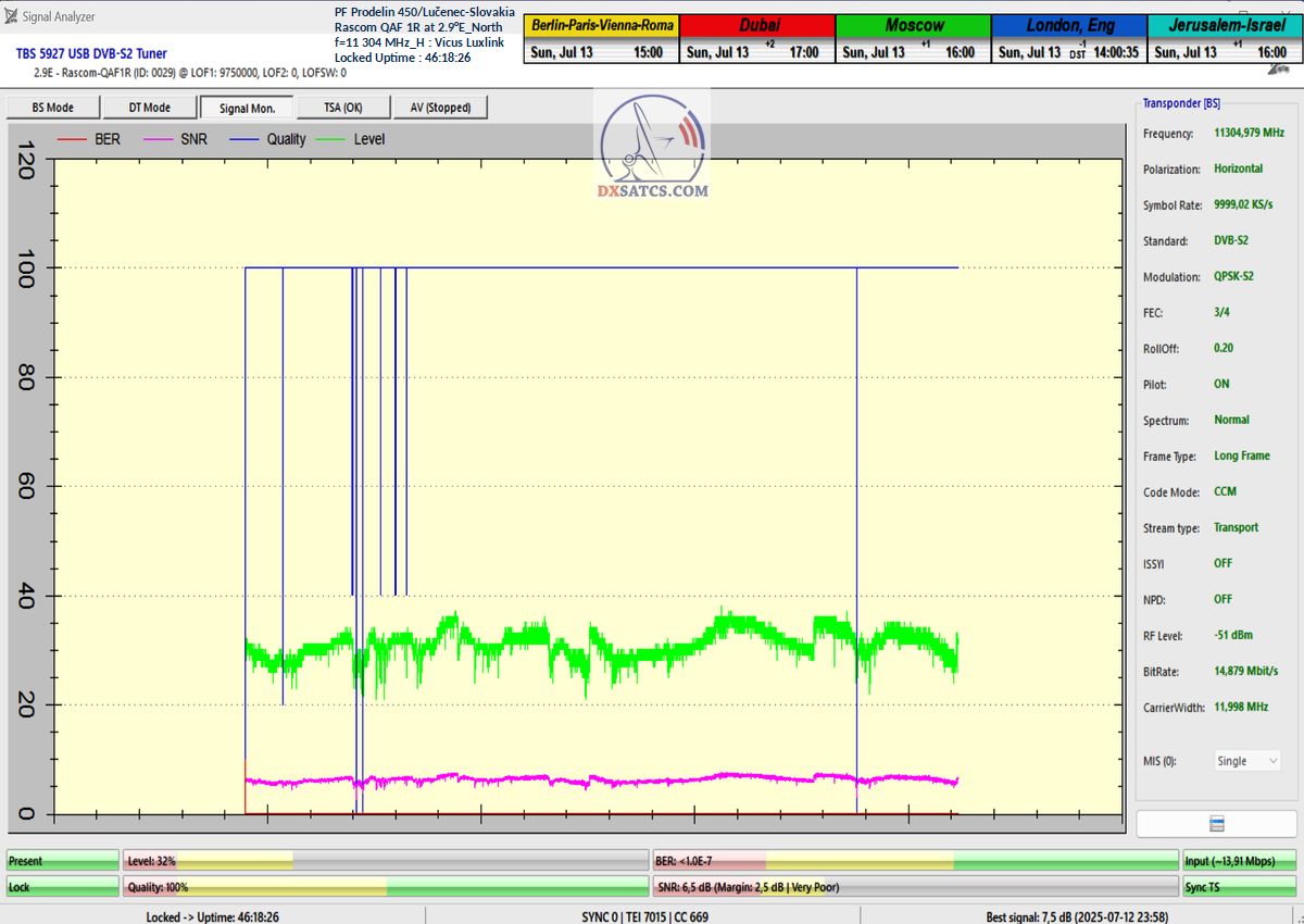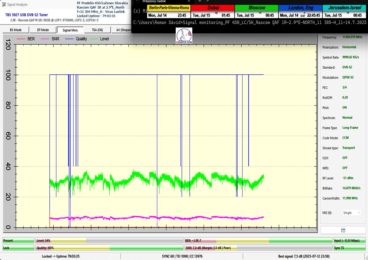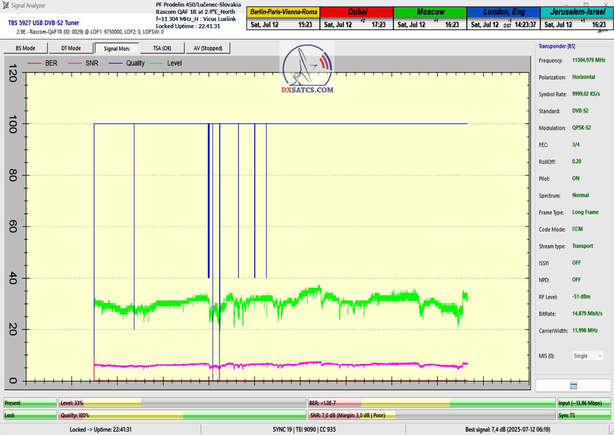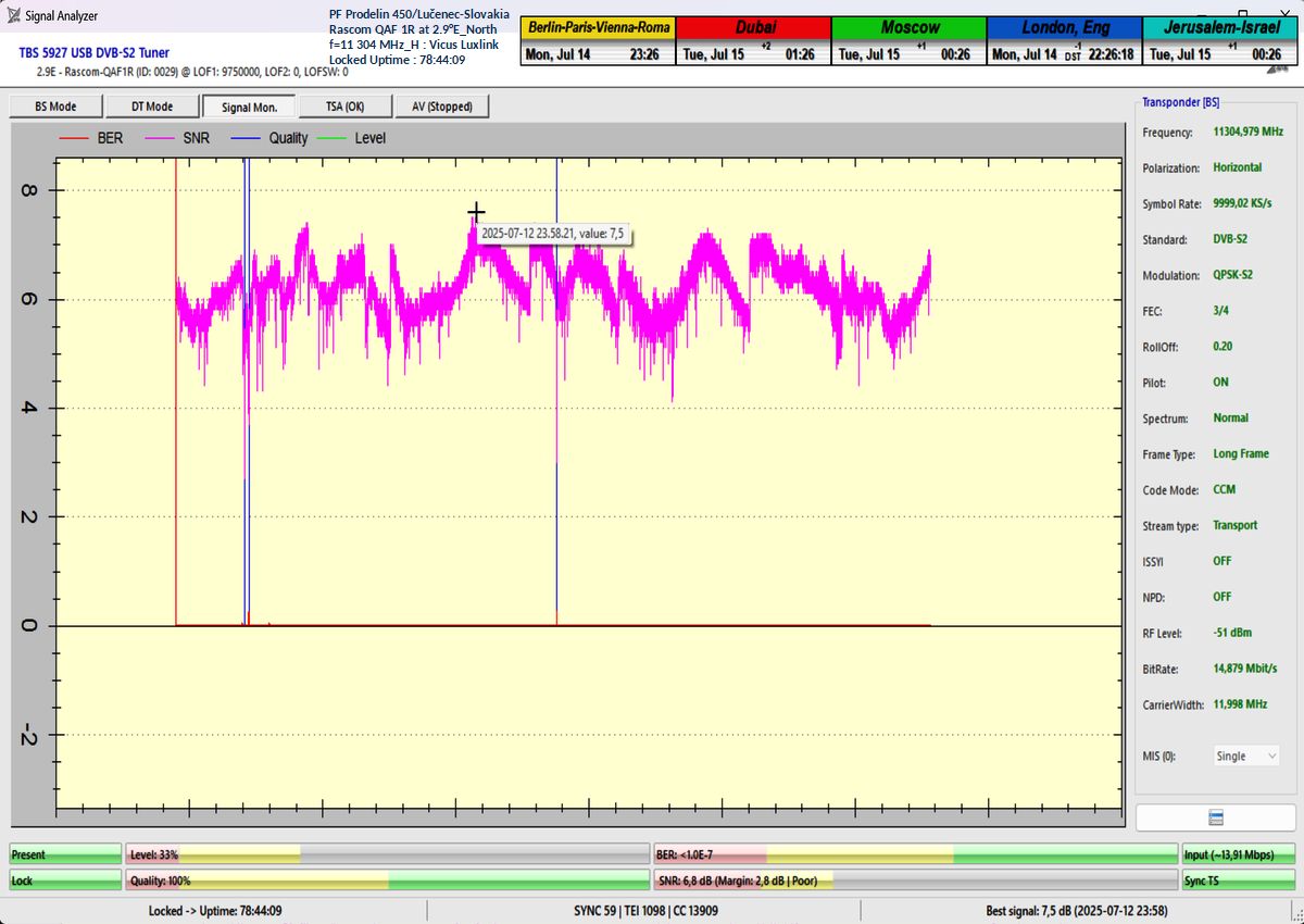 ►EN_Classification of achieved results at f=11 305 MHz : As confirmed by the visualized form of verification in the signal monitoring over a duration of t = 79 hours (which corresponds exactly to 284,400 seconds),Lock losses or quality oscillations near the noise threshold occurred for a total of only fifteen seconds out of the full 284,400 seconds.This corresponds to a reception stability rate of exactly 99.99%.