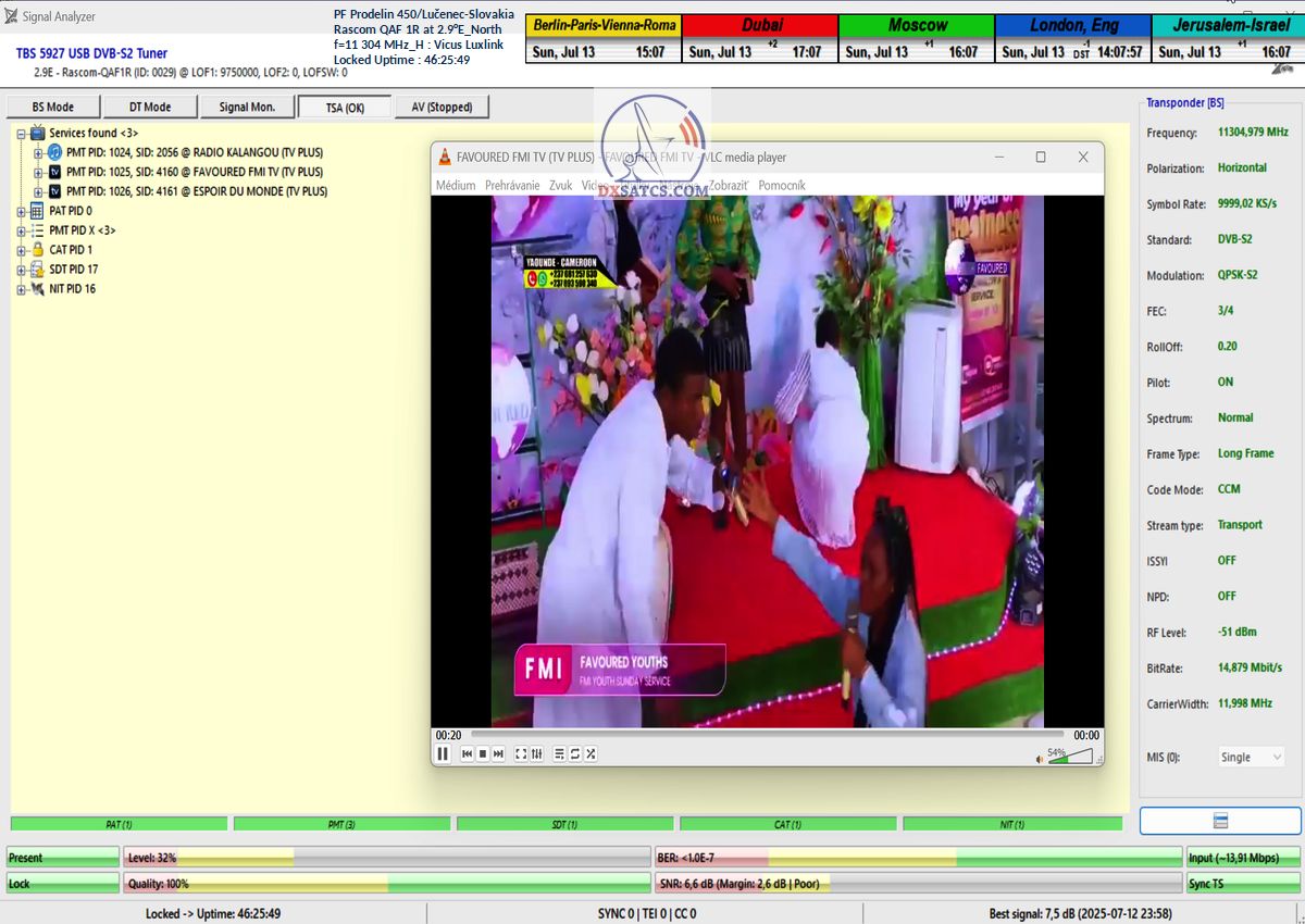 >DE_Verifizierung der technologischen Erfindung „Synchron-Nanokorrekturen“ durch den Wissenschaftler und Erfinder Roman Dávid aus Lučenec beim Satellitenempfang aus dem Footprint von NORTH Africa in Mitteleuropa, wo sie sich als einziger Garant für die Erreichung einer Empfangsstabilität von 99,99 % unter dynamisch variablen Signalbedingungen mit häufigen und unregelmäßigen Leistungseinbrüchen (EIRP) erwiesen hat.