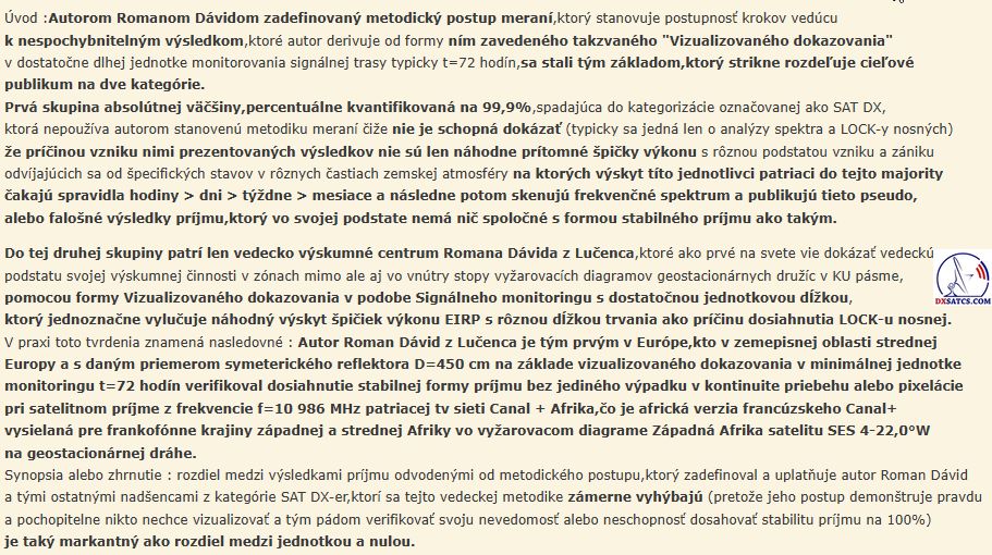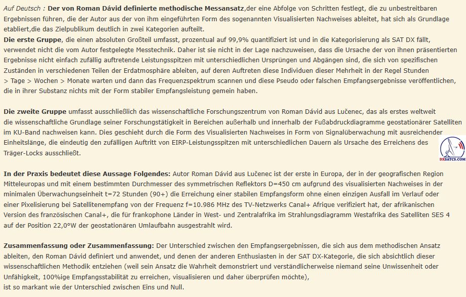 Das wissenschaftliche und Forschungszentrum des Autors Roman Dávid aus Lučenec, das sich auf 'Out of footprint' Satellitenempfangszonen auf www.dxsatcs.com konzentriert,ist nachweislich das erste seiner Art weltweit,dessen Ergebnisse in keiner Weise angezweifelt werden können. Dies liegt daran, dass es seit dem Jahr 2020 ein methodisch definiertes Verfahren zur Messung und Datensammlung aus kontinuierlicher Signalüberwachung mit ausreichender Dauer implementiert hat,wie vom Autor definiert.Das methodische Verfahren,das vom Autor Roman Dávid definiert wurde,schließt klar jede Verbindung der erzielten Ergebnisse mit Erwartungen an sporadisch auftretende Leistungsspitzen oder temporäre atmosphärische Phänomene aus,die vorübergehend eine instabile Form des Satellitenempfangs ermöglichen,die in die Kategorisierung von Zufall oder 'SAT DX' fällt.Während alle Diskussionszentren weltweit bereits seit über 30 Jahren einer pseudowissenschaftlichen Antimethodik der Messungenfolgen,deren Ergebnisse sofort als Ganzes in Frage gestellt und als irrelevant oder sogar überflüssig bezeichnet werden können,handelt das wissenschaftliche Forschungszentrum von Roman Dávid als erstes und einziges auf der Welt nach einem methodischen Messverfahren, das unbestreitbare Ergebnisse liefert,die für weitere wissenschaftliche und Forschungstätigkeiten im Bereich des Satellitenempfangs verwendet werden können.Die Darstellung der Trägerverriegelung im Frequenzspektrum während dynamischer und dauerhafter Änderungen in der Leistungsintensität in diesen Empfangszonen hat selbstverständlich keinerlei wissenschaftlichen Wert,da die Qualität bereits die nächsten Sekunde,Minute,Stunde ... nach der Trägerverriegelung auf null sinken kann,was die gesamte Präsentation dieser Pseudoanalyse im Wesentlichen nutzlos und betrügerisch macht.