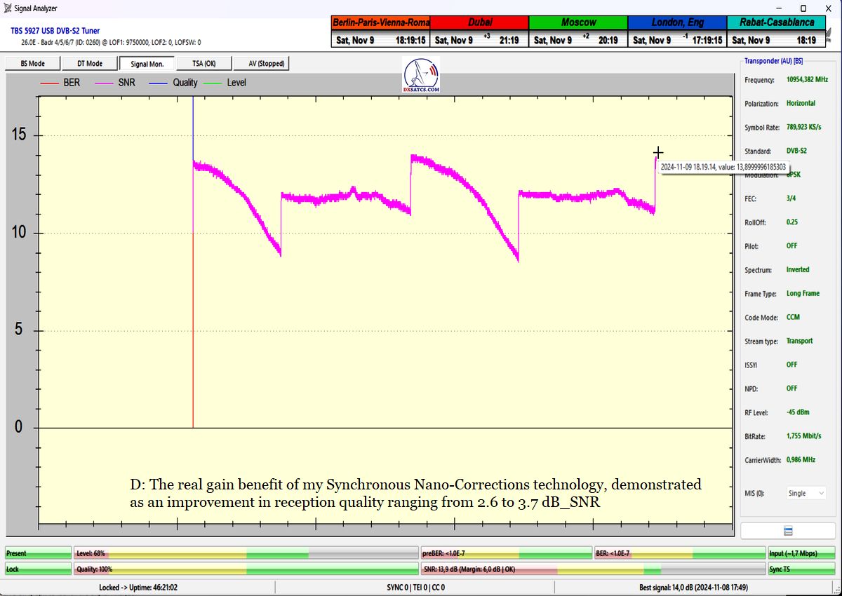 ►The quality increases abruptly and within seconds by up to 3.7 dB, rising from an SNR of 8.5 to 12.2 dB after I entered updated data into the system,